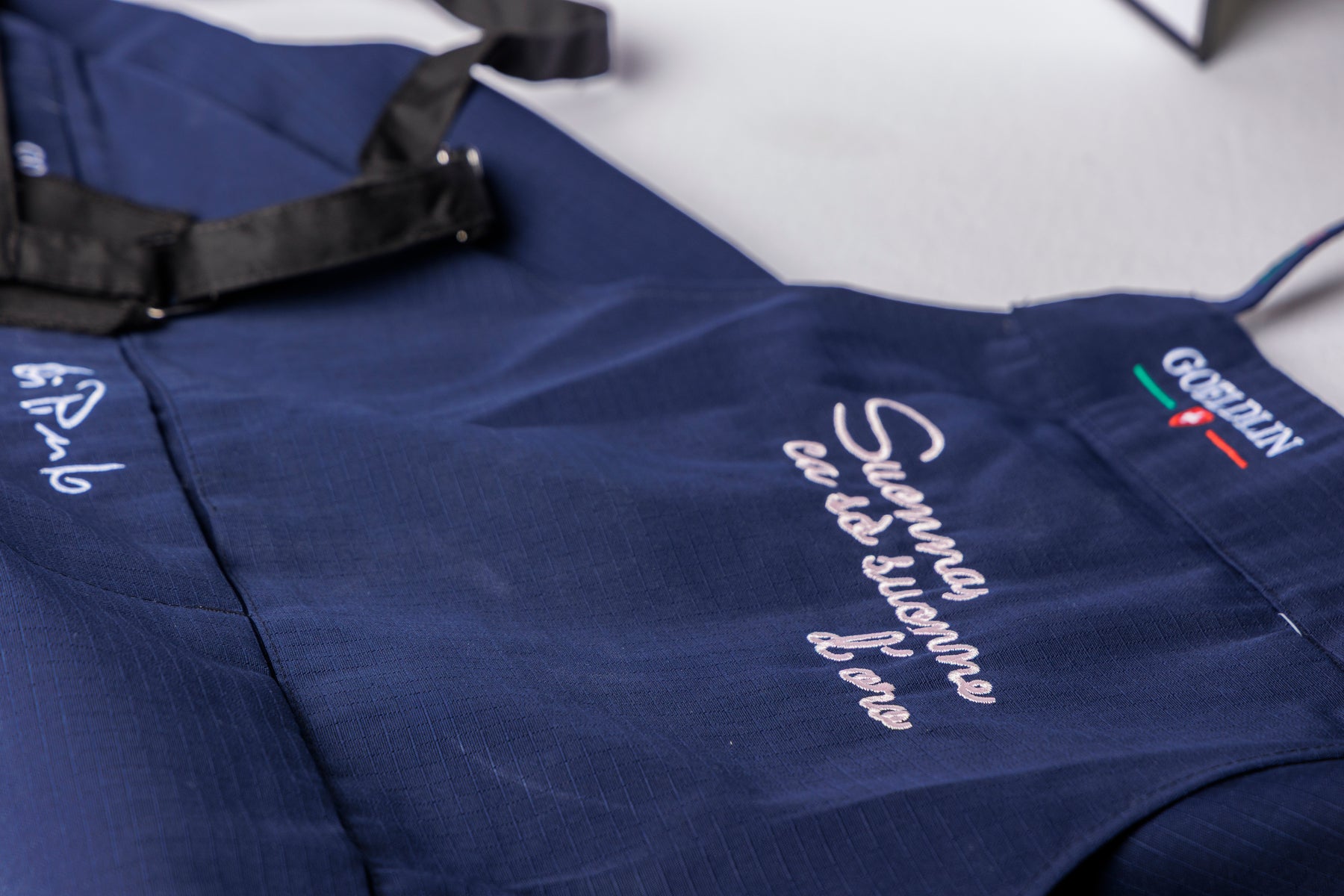 Blue apron with “Suonna ca so’ suonne d’oro” print and Di Pinto signature. Practical, original, and ideal for any cooking enthusiast.